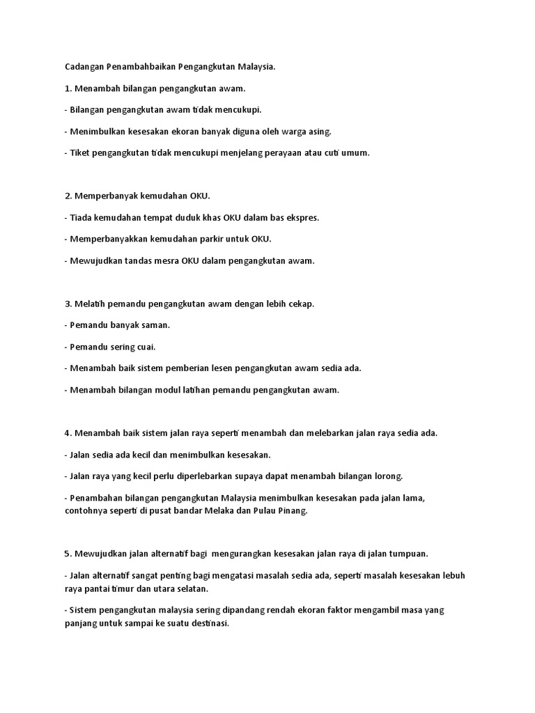 Cadangan Penambahbaikan Pengangkutan Malaysia Di Malaysia Pada Masa Kini Cadangan Penambahbaikan Studocu